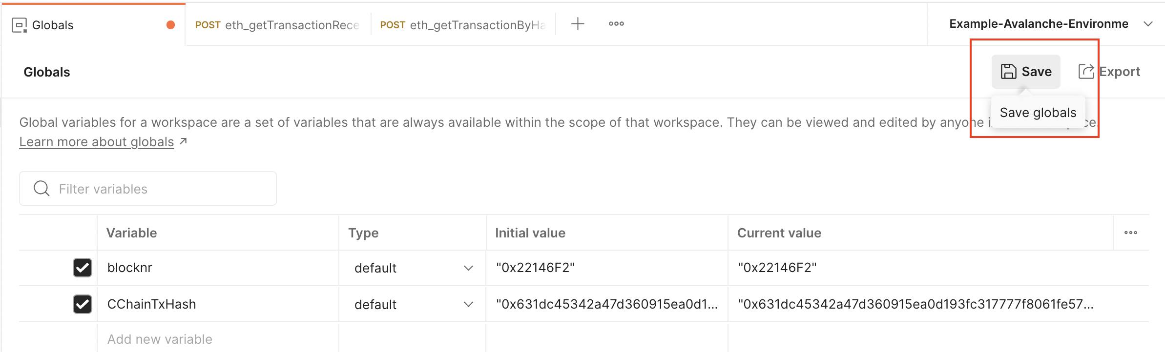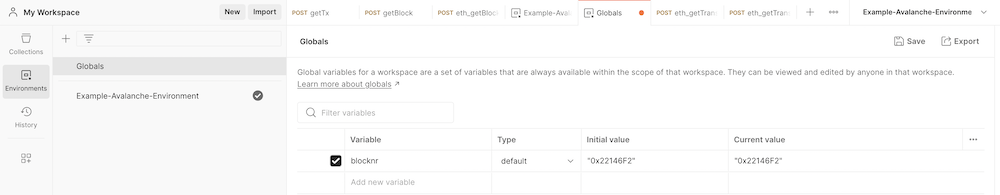 Only default variables are used in the Avalanche Environment file. To learn more about using the secret type of variables, please checkout the Postman documentation.